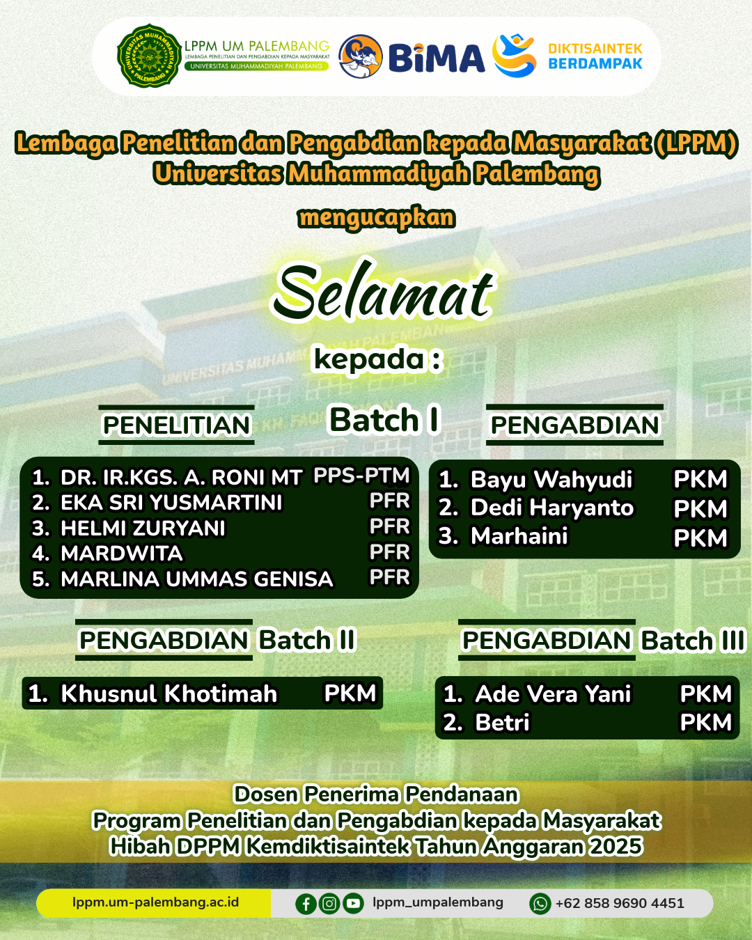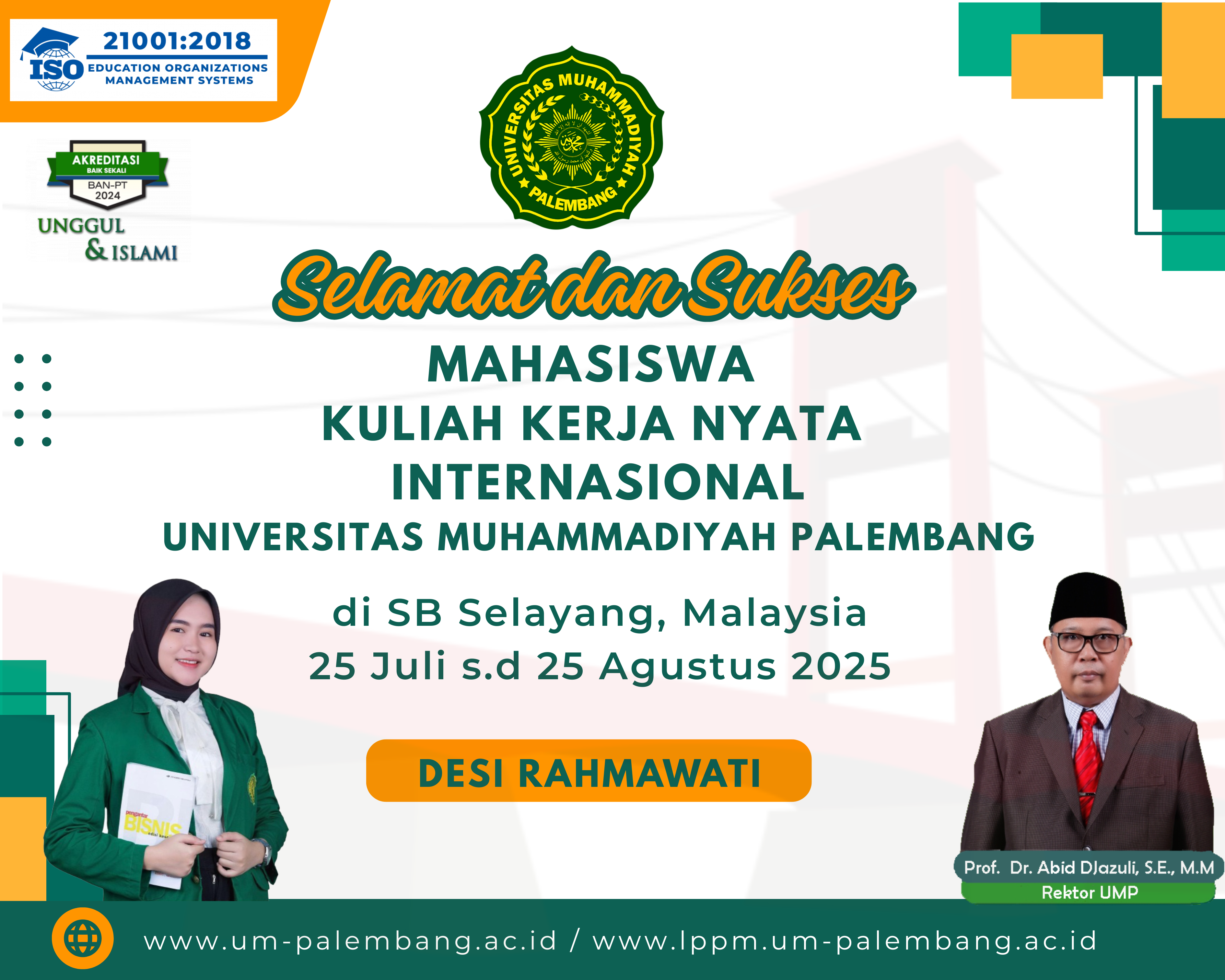 Kemudian ada 75 mahasiswa Universitas Muhammadiyah Palembang mengikuti KKN Merdeka Belajar Kampus Merdeka (MBKM) Wilayah Sumatera Selatan dan 3 mahasiswa Universitas Muhammadiyah Palembang mengikuti KKN Internasional di Negara Arab Saudi.