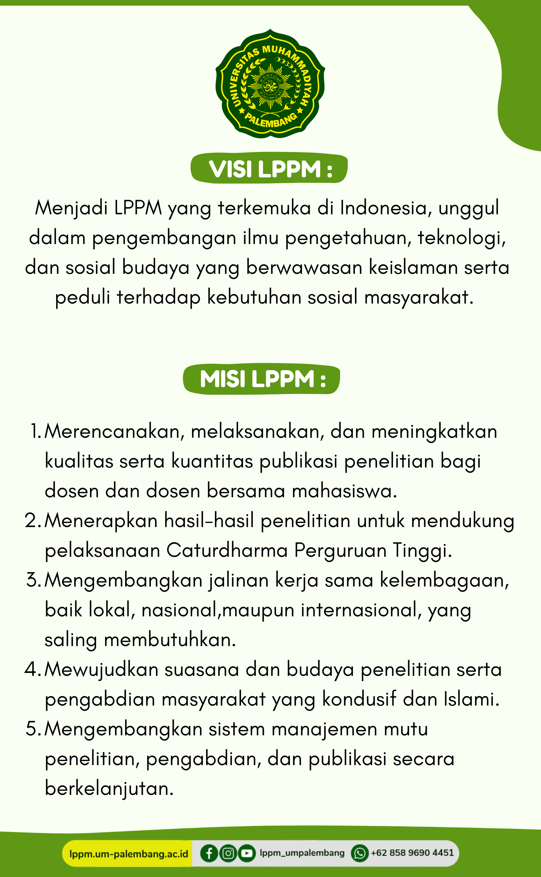 Lembaga Penelitian dan Pengabdian kepada Masyarakat (LPPM) Universitas Muhammadiyah Palembang (UM Palembang) sebagai salah satu unsur pelaksana akademik di lingkungan UM Palembang, yang bertugas mengkoordinasikan, memantau, menilai pelaksanaan kegiatan penelitian dan pengabdian masyarakat (Statuta UM Palembang Pasal 69 ayat 1).